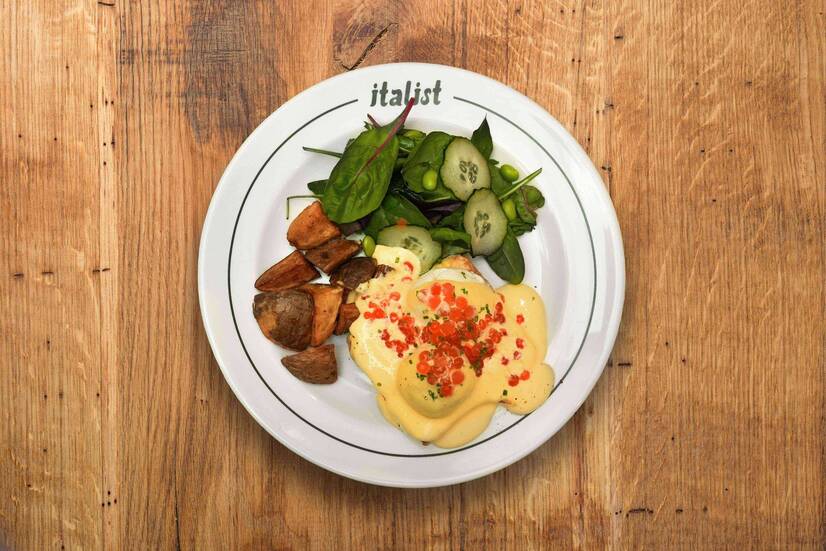 Italist pizza & pasta Бенедикт з червоною ікрою на мафіні з органічного борошна