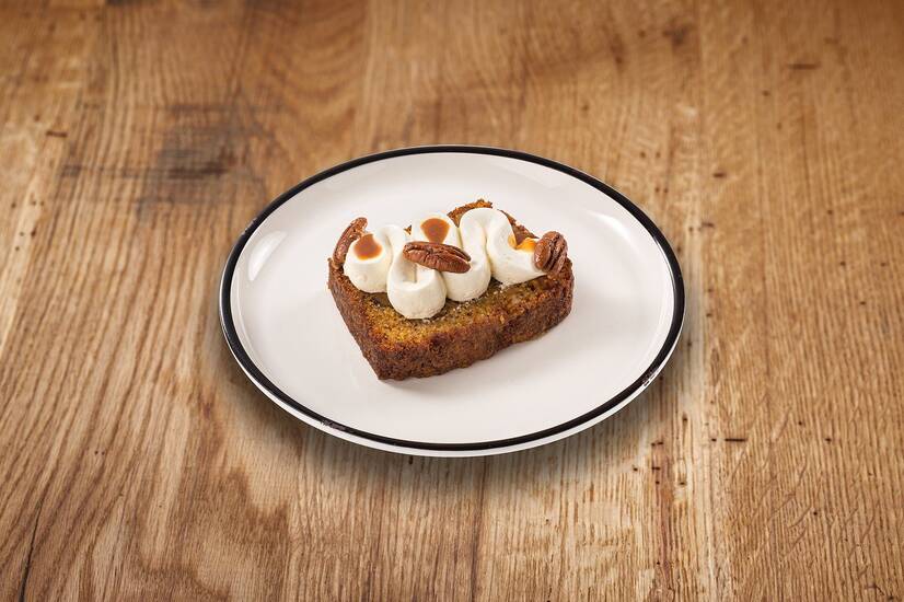 Ніжний кекс з горіхами, просочений апельсиновим конфітюром, крем маскарпоне, карамель та пекан