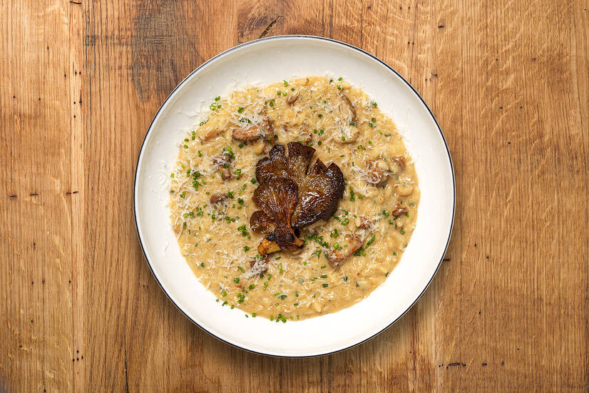 Італійський рис середнього розміру, білі гриби, лисички, гливи, пармезан, цибуля порей та соус деміглас
