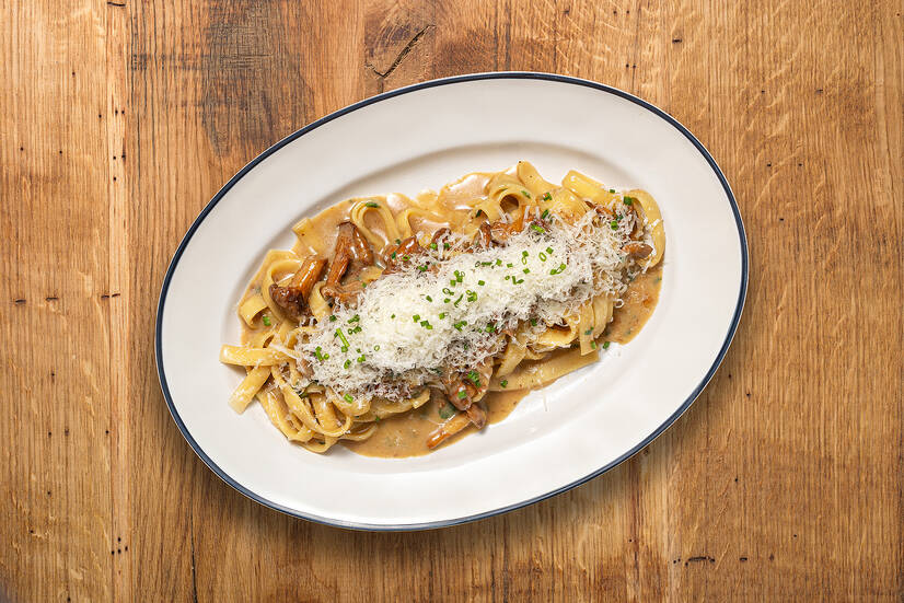 Паста тальятеле, лисички, пармезан та цибуля порей