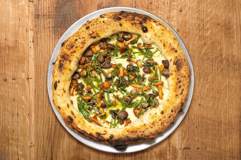 Ферментоване тісто з італійського борошна витримане 48 годин, лисички, печериці, моцарела, сир фонталь, трюфельна олія та соус песто