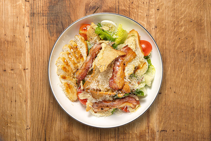 Салат цезар з грильованою індичкою та кранчами з бекону