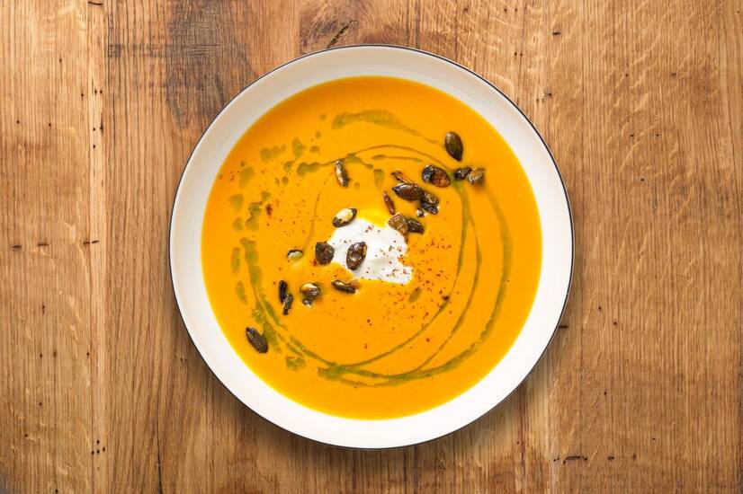 Ніжний гарбузовий крем-суп з кремом з фети , зеленим маслом, чорним перцем та карамелізованим гарбузовим насінням